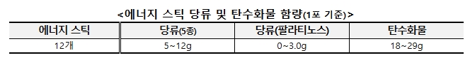 다만, 운동 등 신체활동이 아닌 일상생활 속에서 에너지 스틱 제품을 섭취할 경우에는 당류 등 함유 성분의 함량을 확인하고 섭취량을 조절할 필요가 있다.