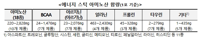 에너지 스틱은 당류 등 탄수화물 외에도 단백질 구성 성분인 아미노산*을 에너지원 및 신체활동에 도움을 주는 주요 성분으로 함유하고 있었다. 일정량 이상의 아미노산(18종)을 함유한 10개 제품**은 1포 기준 220~2,828㎎을 함유해 제품 간 최대 13배 차이가 났다.