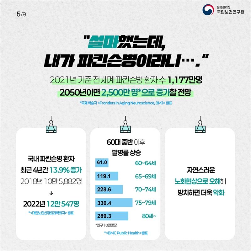 질병관리청(청장 임승관) 국립보건연구원(원장 직무대리 김원호)은 파킨슨병에 대한 국민의 이해를 높이기 위해, 「파킨슨병 바로알기」카드뉴스를 제작·배포하고, 파킨슨병 코호트 사업의 주요 성과를 공개했다.