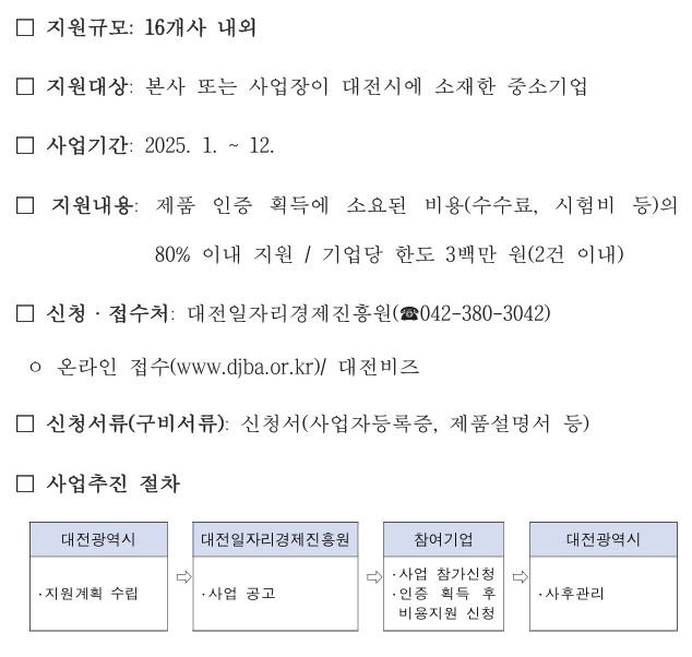 국내 제품인증 획득 지원 ※ 이 기사는 대전일자리경제진흥원에서 제공한 보도자료를 바탕으로 작성되었습니다. 0 0 월드타임스 월드타임스 sun8235050@naver.com 월드타임스의 기사 더보기 저작권자 ⓒ 월드타임스, 무단 전재 및 재배포 금지