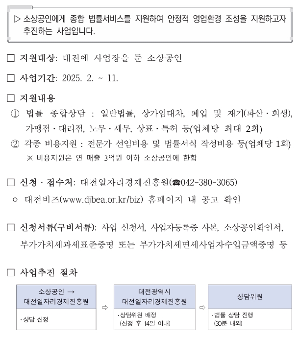 소상공인 법률서비스 지원 ※ 이 기사는 대전일자리경제진흥원에서 제공한 보도자료를 바탕으로 작성되었습니다. 0 0 월드타임스 월드타임스 sun8235050@naver.com 월드타임스의 기사 더보기 저작권자 ⓒ 월드타임스, 무단 전재 및 재배포 금지