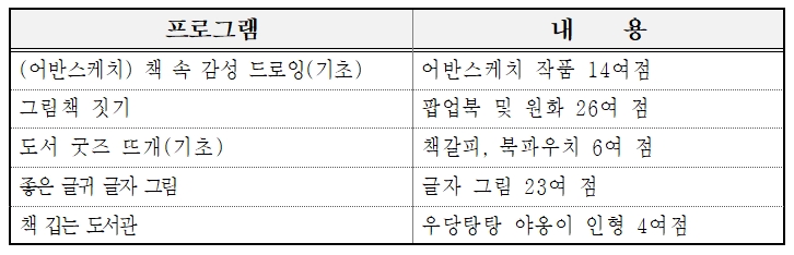 이번 전시에는 어반스케치, 그림책 짓기, 도서 굿즈 뜨개, 좋은 글귀 글자 그림, 책 깁는 도서관 등 프로그램 참여자들이 완성한 70여 점의 창작 작품을 통해 배움의 과정과 성장을 지역 주민들과 공유한다.
