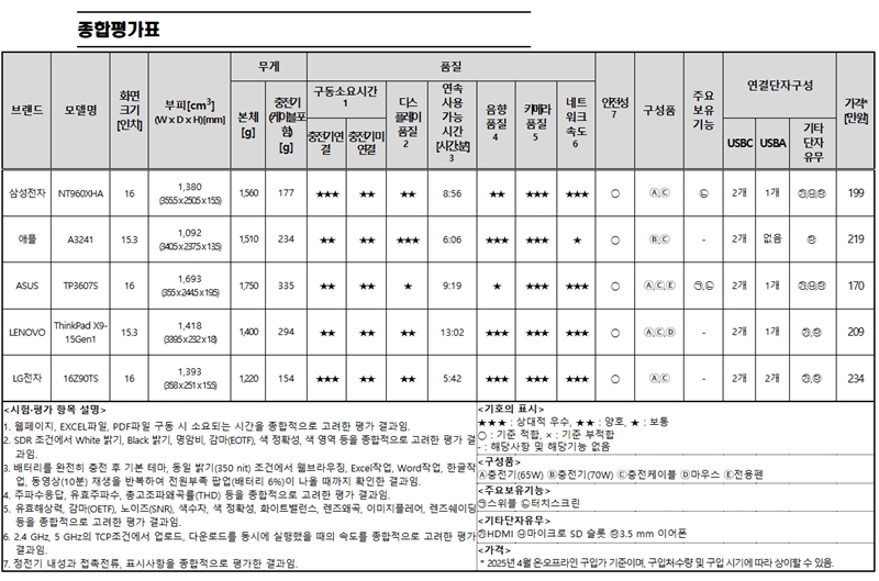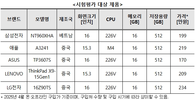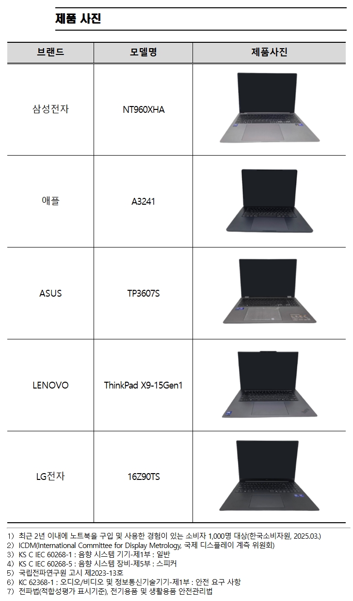노트북은 업무와 일상에서 자주 사용하고 구매 가격대가 높아 소비자들의 관심이 높은 제품이다. 이에 한국소비자원(원장 윤수현)이 2025년 출시된 인기 노트북 5개 제품의 품질(휴대성·구동소요시간·디스플레이 품질·연속 사용가능시간 등), 안전성 등을 시험평가했다.