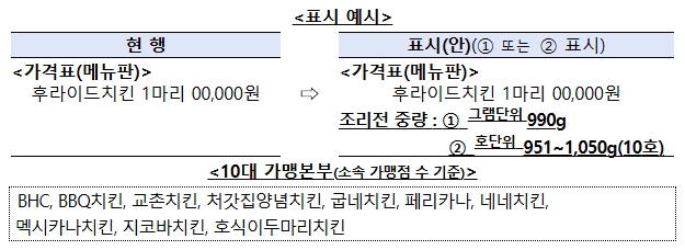 식약처는 올해 12월 15일부터, 식품위생법 시행규칙 유권해석을 통해 치킨 중량표시제를 도입한다. 이에 따르면, 치킨 전문점은 치킨의 ‘조리 전 총 중량’을 그램(g) 또는 ‘호’ 단위로, 메뉴판의 가격 옆에 표시하여야 한다. 소비자들이 온라인으로 주문하는 웹 페이지나 배달앱에도 같은 방법으로 표시하여야 한다. 다만 해당 의무는 모든 치킨전문점이 아니라, 10대 치킨 가맹본부 소속 가맹점(약 12,560개사)에게만 부과된다. 대규모 가맹본부들이 다른 가맹본부에 비해 가맹점들의 의무 준수를 더 잘 지원할 수 있다는 점을 고려하였다.