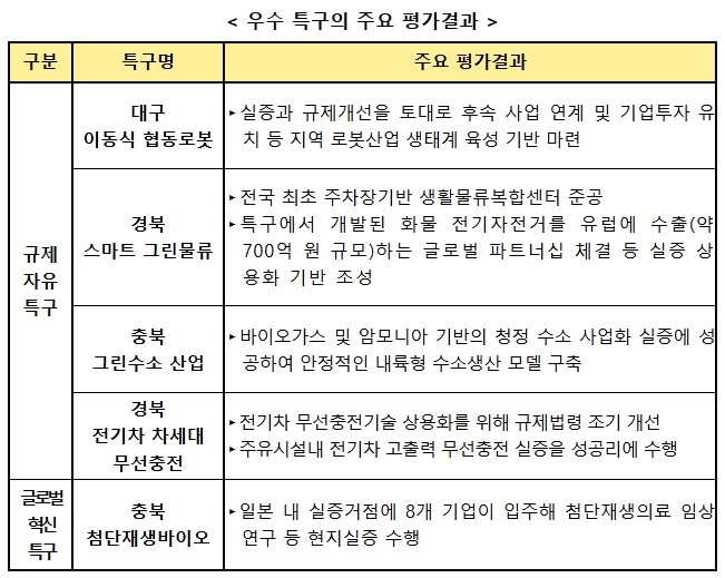 특구별로 정책목표 이행실적, 실증‧규제 관리 성과, 특구 참여기업의 경영 성과 등을 종합하여 규제자유특구에서 ▸대구 이동식 협동로봇, ▸경북 스마트 그린물류, ▸충북 그린수소산업, ▸경북 전기차 차세대 무선충전 등 총 4개의 우수 특구를 선정하였고, 글로벌 혁신특구에서는 ▸충북 첨단재생바이오 특구를 우수 특구로 선정하였다.