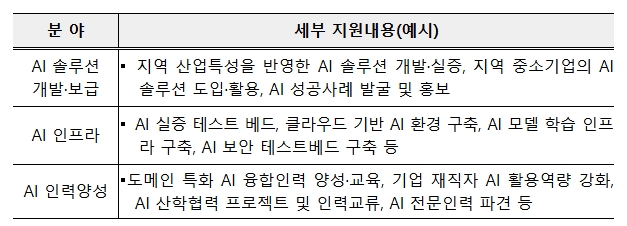 지역 주도형 AI 대전환 사업은 중소벤처기업부에서 AI 활용률이 낮은 지역 중소기업의 빠른 AI 전환을 위해 2차 추경을 통해 350억원 규모의 예산을 확보한 신규사업이다. 지방정부가 지역산업의 특성을 반영하여 자율적으로 기획한 AX 활용·확산 사업에 대해 공모를 통해 경남, 대구, 울산, 전남, 제주 등 5개 지방정부를 선정(10.1)한 바 있다.