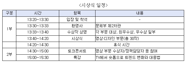 공모전 시상식은 12월 8일(월), 회의실 바이(by) 필원(서울 종로구)에서 열린다. 문체부 김대현 제2차관은 시상식 현장을 찾아 영상·디자인 부문별 대상과 최우수상을 시상하고 수상자들을 격려할 예정이다. 이번 시상식에서는 수상자들과 국정과제 담당 공무원들이 정책 홍보에 대한 궁금증을 해소하고, 영상 제작 과정에서 있었던 이야기들을 함께 나누는 ‘이야기 콘서트’도 마련했다. 개그맨 권재관이 ‘이야기 콘서트’를 진행하고 <개그콘서트>와 <1박 2일>, 드라마 <프로듀사> 등을 연출한 서수민 피디[(주)링가링 대표]가 ‘티브이(TV)에서 숏폼으로 트렌드 변화와 대응법’을 주제로 특강도 한다.