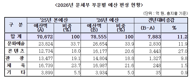 문화체육관광부(장관 최휘영, 이하 문체부)는 2026년도 문체부 예산이 7조 8,555억 원으로 최종 확정되었다고 밝혔다. 이는 올해 본예산 대비 7,883억 원(11.2%)이 증가한 규모이다. 문체부는 이번 예산을 ‘케이-컬처’ 300조 원 시대 출발을 위한 예산으로 콘텐츠산업의 국가전략산업화, 국민이 함께 누리는 관광 등에 주력해 편성했다고 밝힌 바 있다.