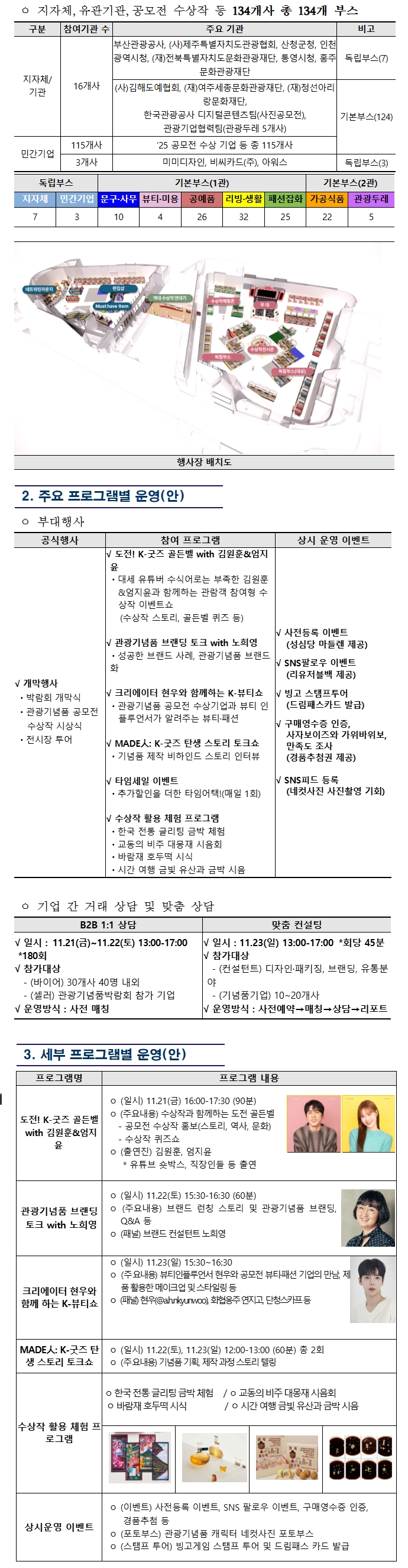 ㅇ (주요내용) 개막행사(시상식), 관광기념품 전시·판매, 주요 부대행사 등 진행