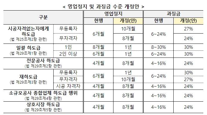 ㅇ (영업정지 및 과징금) 불법하도급을 한 자에 대한 영업정지는 현행 4~8개월에서 최소 8개월~최대 1년으로, 과징금은 현행 4~30%에서 전체 하도급대금의 24~30%로 상향한다. 이는 현행 「건설산업기본법」에서 정하고 있는 최고 수준(영업정지 최대 1년, 과징금 최대 30%)이다.