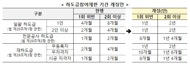 ㅇ (하도급참여제한) 불법하도급으로 행정처분 받은 자에 대한 공공건설공사 하도급참여제한 기간은 현행 1~8개월에서 8개월~2년으로 상향한다. 이 역시 현행 「건설산업기본법」에서 정하고 있는 최고 수준(최대 2년)이다.