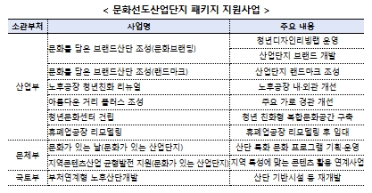 문화선도산단은 산업단지에 문화를 담아 청년이 찾는 활력 넘치는 공간으로 전환하기 위한 사업으로, 새 정부 국정과제에 포함되었다. ▲산업단지의 주력업종·역사성 등을 반영해 통합 브랜드(로고·색채·디자인 등)와 랜드마크를 구축하고, 국토부 노후산단 재생사업, 산업부 구조고도화 사업, 문체부 산단 특화 문화프로그램 지원사업 등 관계부처 사업을 종합적으로 지원한다. `25년 문화선도산업단지 3개소 최초 선정(구미, 창원, 완주)에 이어 `26년 문화선도산업단지 3개소를 신규로 선정한다.