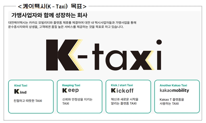 대전케이택시의 브랜드‘케이택시(K-Taxi)’는 올해 3월 출범한 대전지역 1호 가맹택시‘꿈T’에 이어 두 번째로 면허를 받은 가맹택시다. Kind Taxi(친절하고 따뜻한 택시), Keeping Taxi(신뢰와 안정성을 지키는 택시), Kick/start Taxi(혁신과 새로운 시작을 알리는 플랫폼 택시), Another Kako Taxi(카카오T 플랫폼을 사용하는 택시)를 목표로 하고 있다.