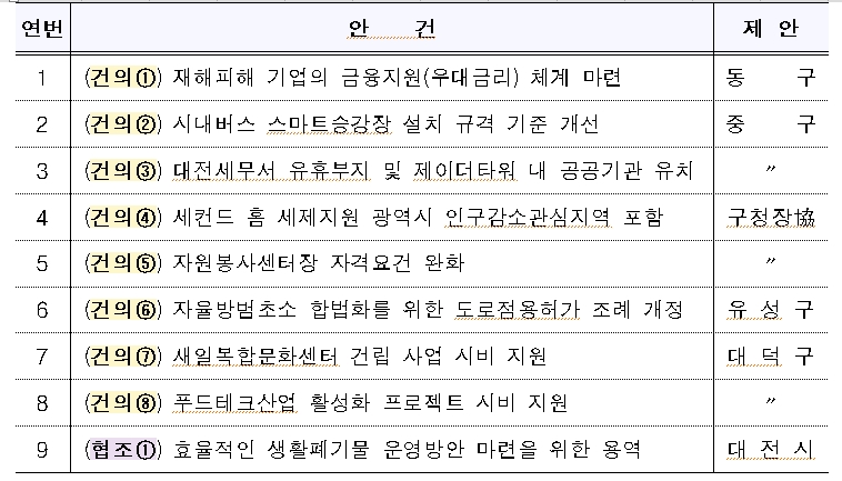 이 외에도 ▲중구의 ‘시내버스 스마트승강장 설치 규격 기준 개선’ ▲구청장협의회의 ‘세컨드 홈 세제지원 광역시 인구감소관심지역 포함, ‘자원봉사센터장 자격요건 완화’ ▲유성구의 ‘자율방범초소 합법화를 위한 도로점용허가 조례 개정’ ▲대덕구의 ‘새일복합문화센터 건립 사업 시비 지원’, ‘푸드테크산업 활성화 프로젝트 시비 지원’ 등 다양한 의제가 다뤄졌다.
