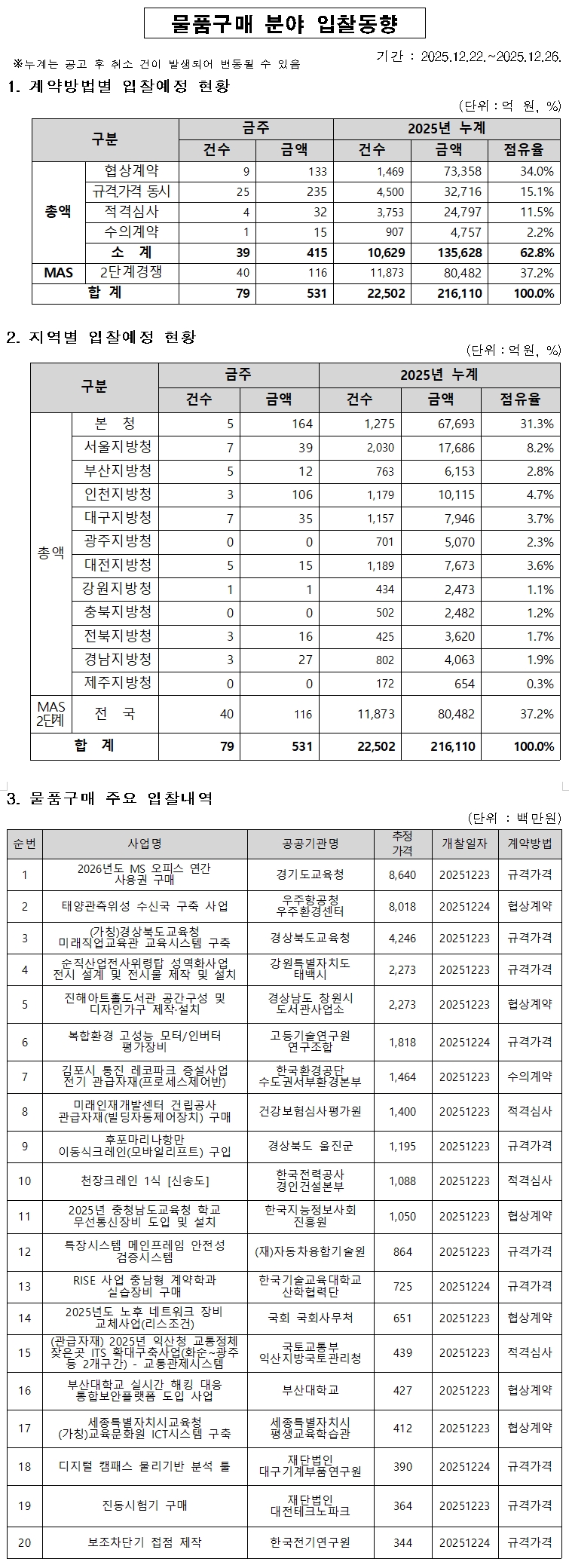 조달청은 ’25.12.22. ~ '25.12.26. 기간 중 경기도교육청 수요 ‘2026년도 MS 오피스 연간 사용권 구매’ 등 총 79건, 약 531억 원 상당의 물품구매 입찰을 집행할 예정이다.