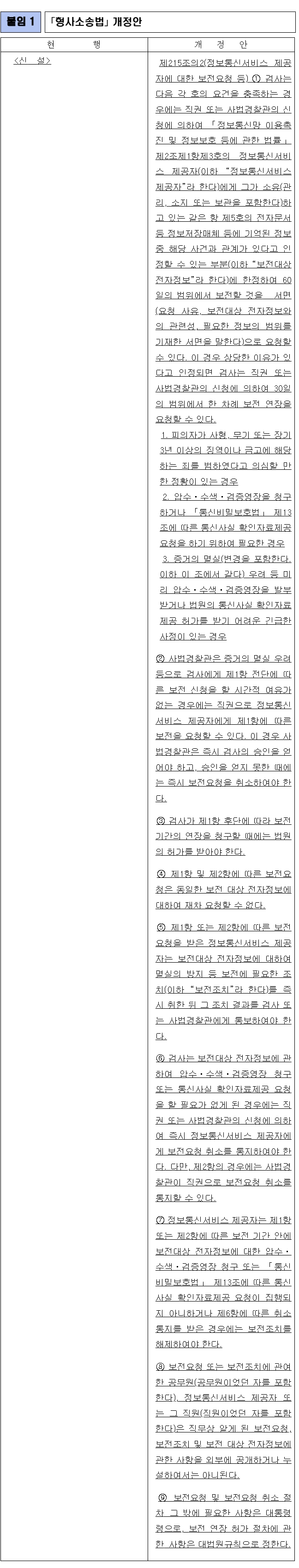 개정안은 검사가 직권 또는 사법경찰관의 신청에 따라* 정보통신서비스 제공자에게 전자증거의 보전을 요청할 수 있도록 하고, 보전요청을 받은 정보통신서비스 제공자는 전자증거에 대해 보전조치를 즉시 취한 다음 그 조치 결과를 검사 또는 사법경찰관에게 통보하도록 규정하였다.