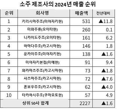 제국 데이터 뱅크 후쿠오카 지점이 정리한 전국의 소주 메이커 상위 50사의 2024년의 매출액은 총 2,227억엔으로, 전년과 비교했을때 약 1.6% 감소했다. 전년도와 비교하여 마이너스 성장을 기록한 것은 2년만이며, 최대 기업인 키리시마 주조(미야자키현)가 소주의 원료가 되는 고구마 발육에 있어서, 병충해의 영향으로 인해 그 수가 감소한 것이 주된 요인이라고 보여지고 있다. 조사는 매출액에 차지하는 소주 및 아와모리(증류주)의 비율이 5할 이상인 전국의 제조 메이커를 대상으로, 2024년 1~12월 결산을 집계했다.