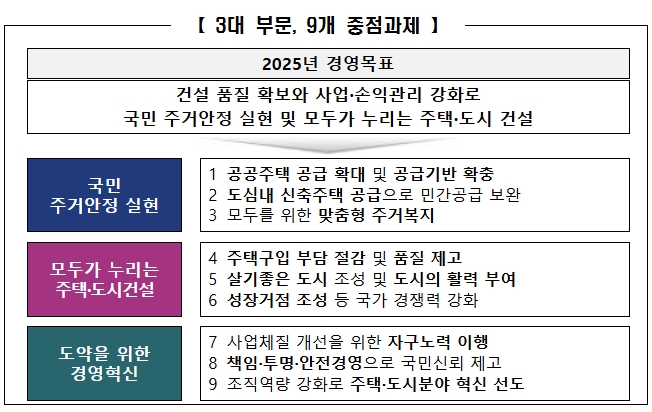ㅇ 대내외 불확실성이 커지고 건설산업의 장기 침체가 우려되는 상황에서, 대규모 주택공급과 과감한 투자집행 등 확대된 공적 역할을 적기에 완수하기 위해 '3대 부문, 9개 중점과제'를 중심으로 가시적인 성과 창출에 매진한다는 방침이다.