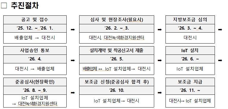 지원대상은 대전시 소재 중․소기업으로 대기환경보전법에 따라 설치․운영중인 4․5종 대기배출 사업장으로, 2026년 12월까지 의무 부착해야 하는 사업장 등을 우선 지원할 예정이다.