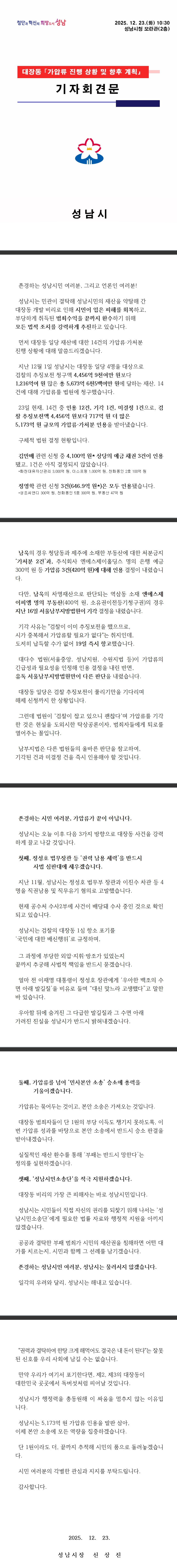 시는 23일 오전 성남시청에서 기자회견을 열고 “현재까지 법원으로부터 총 5,173억 원 규모의 가압류 인용 결정을 받았다”며 “이는 검찰이 형사재판에서 청구했던 추징보전액(4,456억 원)보다 717억 원 더 많은 금액”이라고 밝혔다.