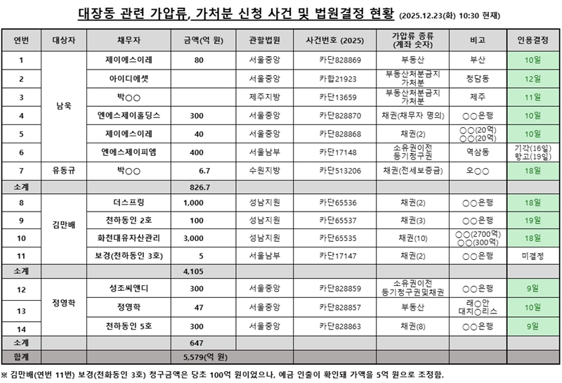인용 대상은 ▲김만배 3건(4,100억 원) ▲남욱 가처분 2건, 가압류 3건(420억 원) ▲정영학 3건(646.9억 원) ▲유동규 1건(6.7억 원) 등이다.