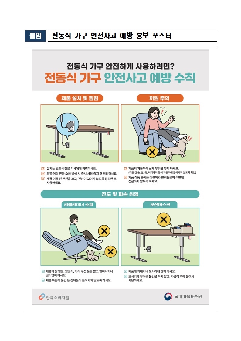 또한, 국표원은 전동식 가구 사용 시 지켜야 할 안전 사용 수칙을 담은 홍보 포스터(붙임 참고)를 제작하여 한국소비자원(원장 윤수현), 한국가구산업협회(회장 이영식), 소비자단체 등과 함께 온·오프라인에 배포할 계획이며, 이를 통해 전동식 가구의 안전하고 올바른 사용 문화 확산에 기여할 것으로 기대한다고 밝혔다.