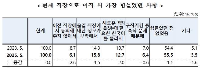 ○ 이직 시 힘들었던 점 없었음(55.5%)은 전기 대비 1.1%p 상승함