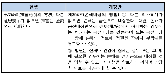 ❍ 손해배상 방법으로 금전배상 외에 원상회복에 의한 배상을 일반적으로 인정(종래 규정은 명예훼손에 대해서만 명예회복에 적당한 처분 인정)하고, 비재산적 손해에 한정하던 정기금 배상의 적용 범위를 확대(‘신체 또는 건강 침해, 그 밖에 필요한 경우’)하였음