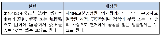 ※ 예컨대 제104조의 “궁박”을 “곤궁하고 절박한 사정”으로, “경솔 또는 무경험”을 “판단력이나 경험의 부족”으로 수정