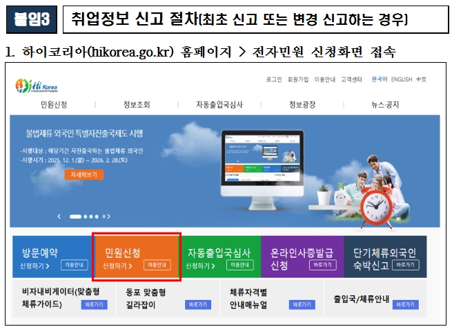 또한, 외국인이 처음 입국하여 외국인등록(거소신고)을 마친 후 취업정보를 최초 신고하는 경우 또는 취업정보에 변동사항이 발생하여 변경신고가 필요한 경우에도 하이코리아(hikorea.go.kr) 홈페이지 ‘전자민원’을 통해 간편하게 신고할 수 있도록 개선됩니다.(붙임3 참조)