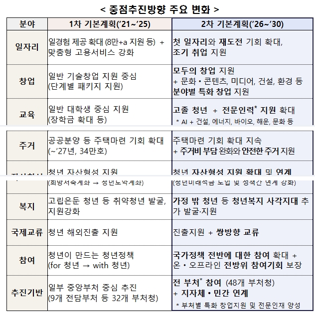 □ 정부는 ‘제2차 청년정책 기본계획(’26~’30)’을 바탕으로 내년부터 각 부처에서 구체적인 연도별 시행계획을 마련해 분야별 맞춤형 청년정책을 추진할 계획이며,