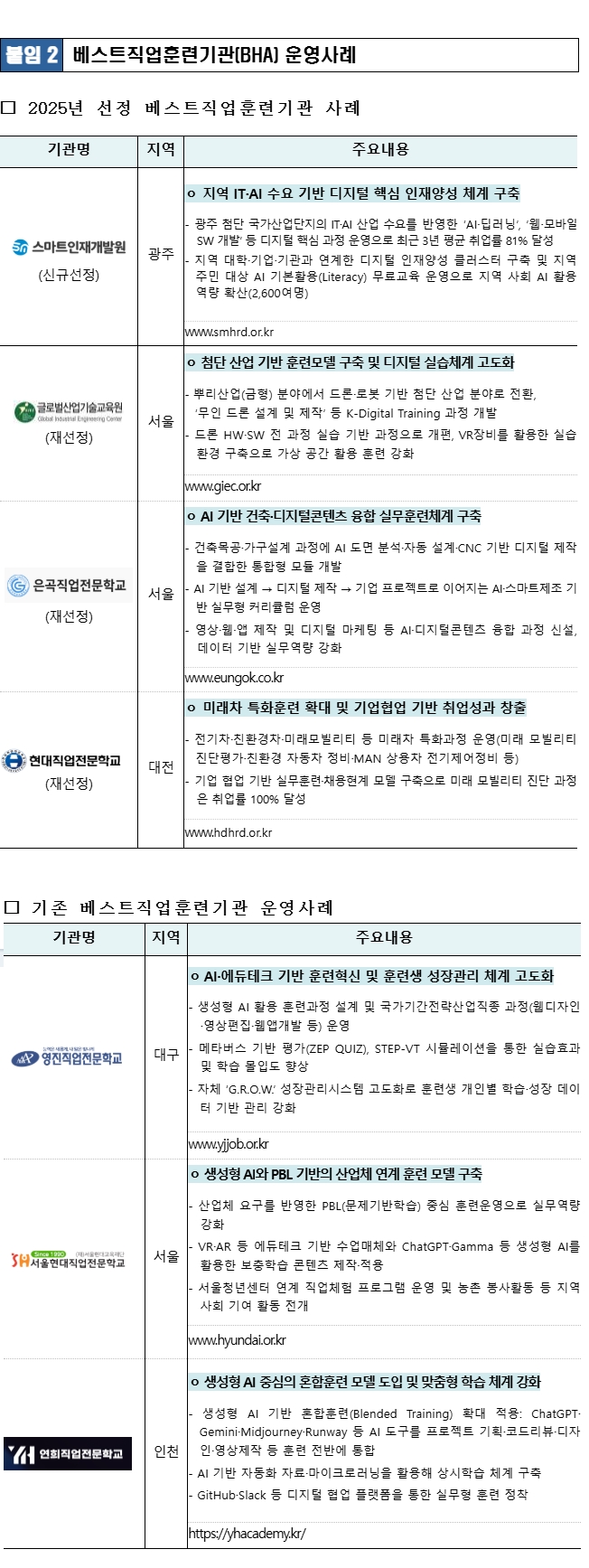 베스트직업훈련기관(BHA)은 급변하는 기술·산업 변화에 발맞춰 훈련과정을 혁신하고 산업계가 원하는 인재를 배출하는 훈련기관을 육성하기 위해 2021년 도입된 제도다.