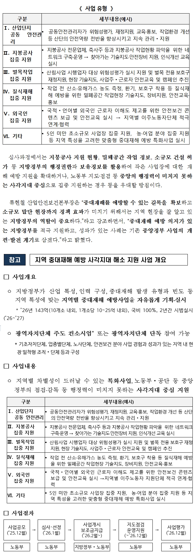 『지역 중대재해 예방 사각지대 해소사업』은 지방정부와 중앙정부가 힘을 합쳐 촘촘한 중대재해 예방 시스템을 구축하기 위해 신설한 사업으로, 지방정부가 산업 현황, 인력 구성, 중대재해 발생 유형‧빈도 등 지역별 특성에 맞는 중대재해 예방 사업을 기획‧신청하면, 10개소 내외의 광역자치단체를 선정하여 지원할 계획이다.