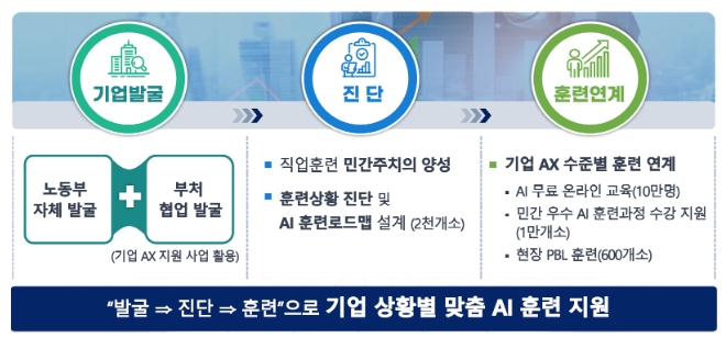 진단 결과를 바탕으로 기업 맞춤형 AI 훈련을 연계한다. 예컨대, AI 훈련 경험이 많지 않은 기업에 대해서는 AI 온라인 무료교육을 지원하여(‘26. 10만명) 진입장벽을 낮추는 한편, AX 기업에 대해서는 직무분석을 바탕으로 맞춤형 훈련과정 개발과 실전 문제해결 방식의 훈련을 제공하는(’26. 600개소) 등 기업 상황에 맞는 AI 훈련을 체계적으로 지원할 예정이다.