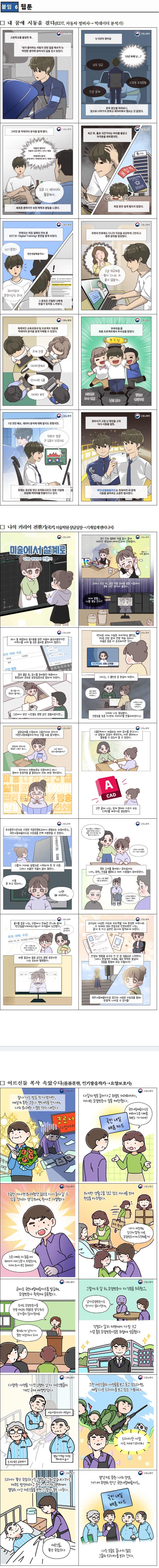 ‣ 6년 차 자동차 엔진 정비사였던 ㄱ 씨는 “10년 뒤 내 모습은?”이라는 불안에 빅데이터 분야에 눈을 돌렸다. 퇴근 후 3개월간 하루 평균 12시간을 투자해 빅데이터 분석 자격증을 취득했지만, 현업 경험이 없어 취업에 어려움을 겪었다. 그는 6개월간 K-디지털트레이닝 ‘AI·데이터·프로그래밍’ 과정을 수강했으며, 프로젝트도 수행했다. 현재, 그는 인공지능(AI) 기반 생성·최적화 솔루션 기업의 생성형 엔진 운영자(Generation Engine Operator)로서, 인공지능(AI) 데이터 파이프라인 운영을 담당하고 있다. <사례집 5p, 웹툰 66p>