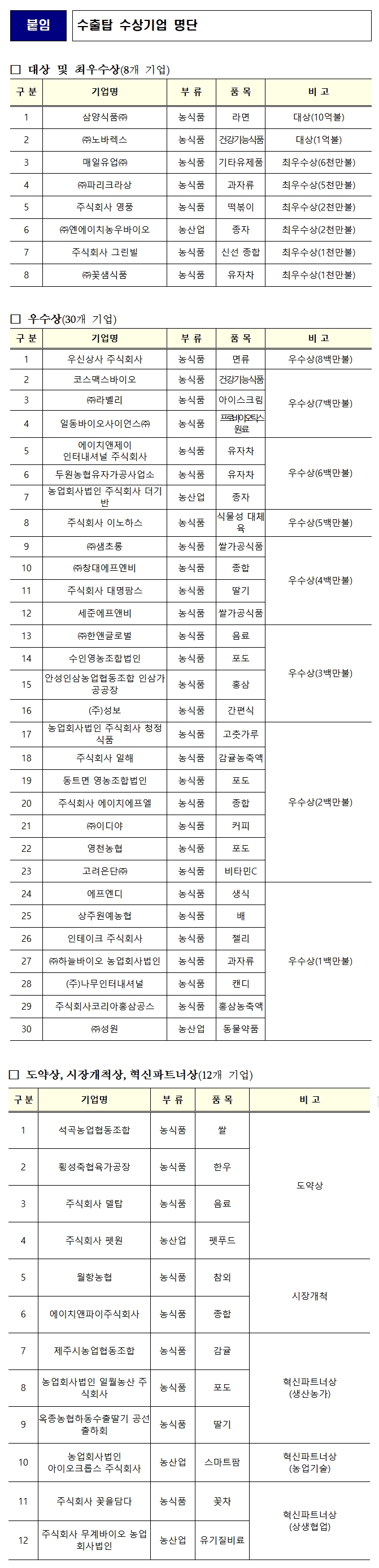 아울러, 케이(K)-푸드의 글로벌 진출 확대를 위해 노력해 온 관계자들의 성과를 격려하기 위한 ‘케이-푸드 플러스(K-푸드+) 수출탑(이하 수출탑) 시상식’을 개최하였다. 올해로 3회째를 맞이하는 수출탑은 억 불대, 천만 불대 등 수출실적에 따라 수여하는 대상․최우수상․우수상과 수출 증가율, 시장 개척 등 성과에 따라 수여하는 도약상․시장개척상․혁신파트너상 등으로 구성된다.
