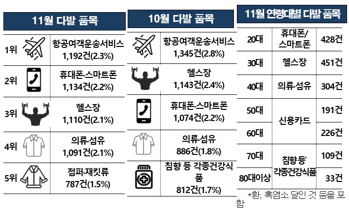 □ 다발 품목은 ’항공여객운송서비스‘, ’휴대폰·스마트폰‘, ’헬스장‘ 순으로 많아