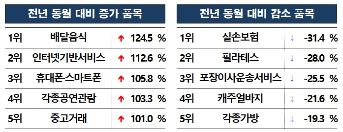 □ 전년 동월 대비 ’배달음식‘ 증가, ’실손보험‘은 감소