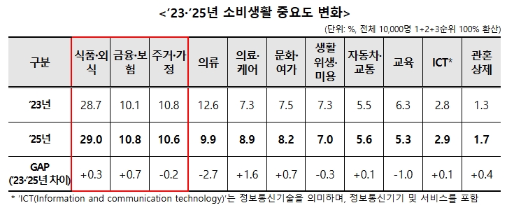 소비자가 가장 중요하게 생각하는 소비생활 분야는 ‘식품외식’ 29.0%, ‘금융보험’ 10.8%, ‘주거가정’ 10.6% 순으로 나타났다. 지난 조사(2023)에서 종합 순위 2위였던 ‘의류’는 올해 4위로 하락한 반면, ‘금융보험’은 4위에서 2위로 상승해 소비생활에서 중요도가 높아진 것으로 나타났다. 고금리고물가고환율 등 대내외 경제 불확실성이 큰 시기에 금융상품에 대한 관심이 높아진 것*으로 풀이된다.