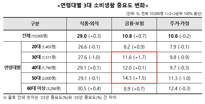 ㅇ (연령대별) 전 연령대에서 금융보험의 중요도가 높아졌고, 50대 14.3%, 40대 12.0%, 30대 11.6% 등 순으로 높았음