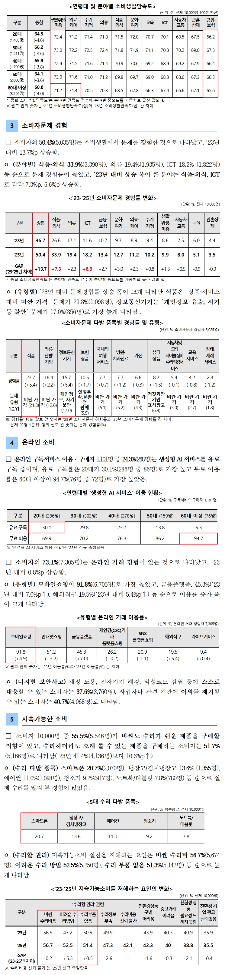 한국소비자원(원장 윤수현)이「2025 한국의 소비생활지표」를 발표했다. 한국소비생활지표는 한국소비자원에서 소비자 정책 개선을 위해 격년마다 발행하는 조사 보고서로, 한국인의 소비 환경과 인식 변화를 알 수 있는 중요한 자료다. 올해 7번째로 조사된 소비생활지표는 ‘소비생활 중요도’, ‘소비생활만족도’, ‘소비자문제 경험’, ‘생성형 AI 서비스 구독 현황’, ‘수리할 권리에 대한 인식’ 등에 대해 전국 1만 명을 대상으로 1:1 면접 조사했다.