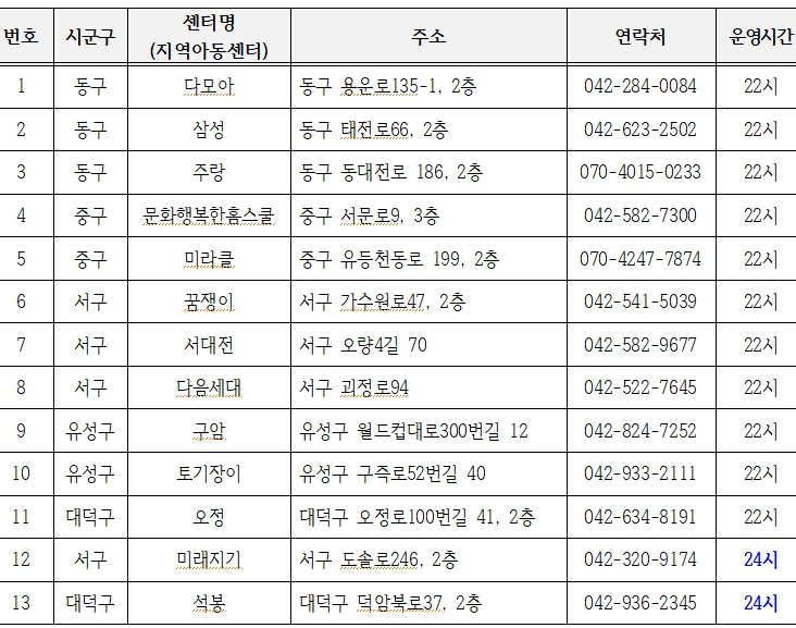 보호자 누구나 밤 10시 또는 12시까지 아동(6~12세)을 맡길 수 있고, 이용시간 2시간 전까지 지역아동센터 대전지원단 콜센터(042-226-2729) 또는 해당 시설로 직접 신청하면 된다. 시설 정보는 아동권리보장원 누리집에서 간편하게 확인할 수 있다.