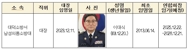 이대식 신임 남성연합회장은 2013년 대덕소방서 의용소방대원으로 임용된 이후 2023년 대덕소방서 남성의용소방대장에 취임 했으며, 각종 소방 보조 활동과 재난 복구 지원, 화재 취약계층을 위한 봉사활동 등에 적극 참여해 왔다.
