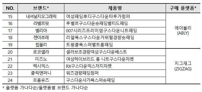 □ 온라인 패션플랫폼 4사*(더블유컨셉, 무신사, 에이블리, 지그재그)에서 판매하고 있는 구스(거위) 다운 패딩 24개 제품