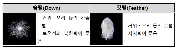 * KS K 2620 : 솜털의 함유율은 표시된 수치 이상이어야 함.