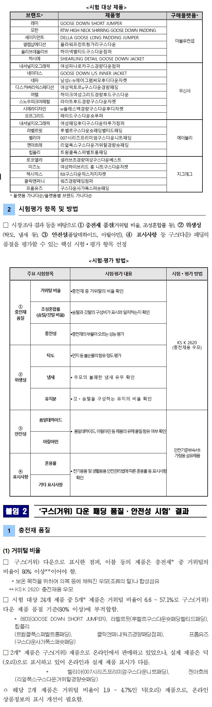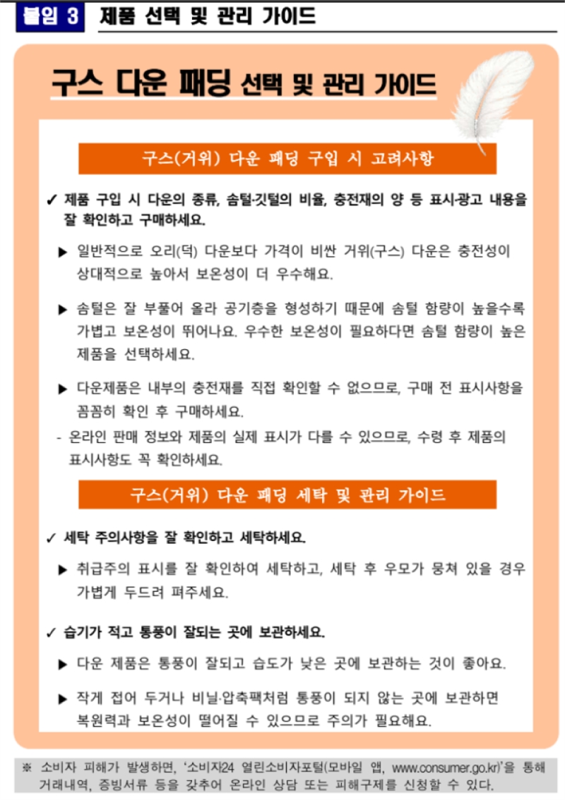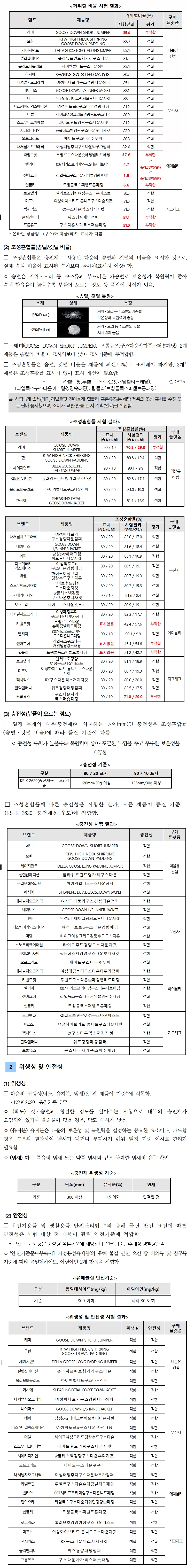 □ 일부 제품, 거위털 비율이 기준에 부적합해(세부내용 7페이지)