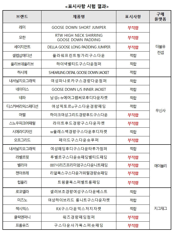 레미(GOOSE DOWN SHORT JUMPER), 프롬유즈(구스다운사가폭스퍼숏패딩) 제품은 조성혼합률(솜털/깃털) 중 솜털의 비율이 표시치보다 낮아 표시기준*에 부적합했고, 3개** 제품은 조성 표시가 없어 표시 개선이 필요했다.
