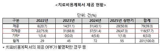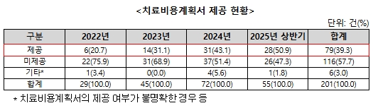 ㅇ 치료비용계획서 제공률은 2022년 20.7%(6건), 2023년 31.1%(14건), 2024년 43.1%(31건), 2025년 상반기 50.9%(28건)였음.