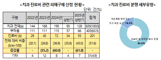 진료비 관련 분쟁은 2022년부터 매년 급증해 치과 관련 피해구제 신청 증가의 주요 원인으로 분석된다. 특히 올해는 상반기에만 55건이 접수돼 전년 동기 대비 61.8% 급증했다.