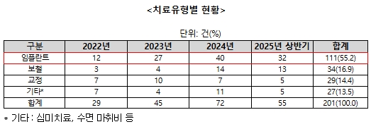진료비 관련 분쟁의 치료유형별로는 임플란트 치료가 55.2%(111건)로 가장 많았고, 이어서 보철 16.9%(34건), 교정 14.4%(29건) 등의 순이었다. 이 중 소비자에게 치료비용계획서가 제공된 경우는 39.3%에 불과했다.